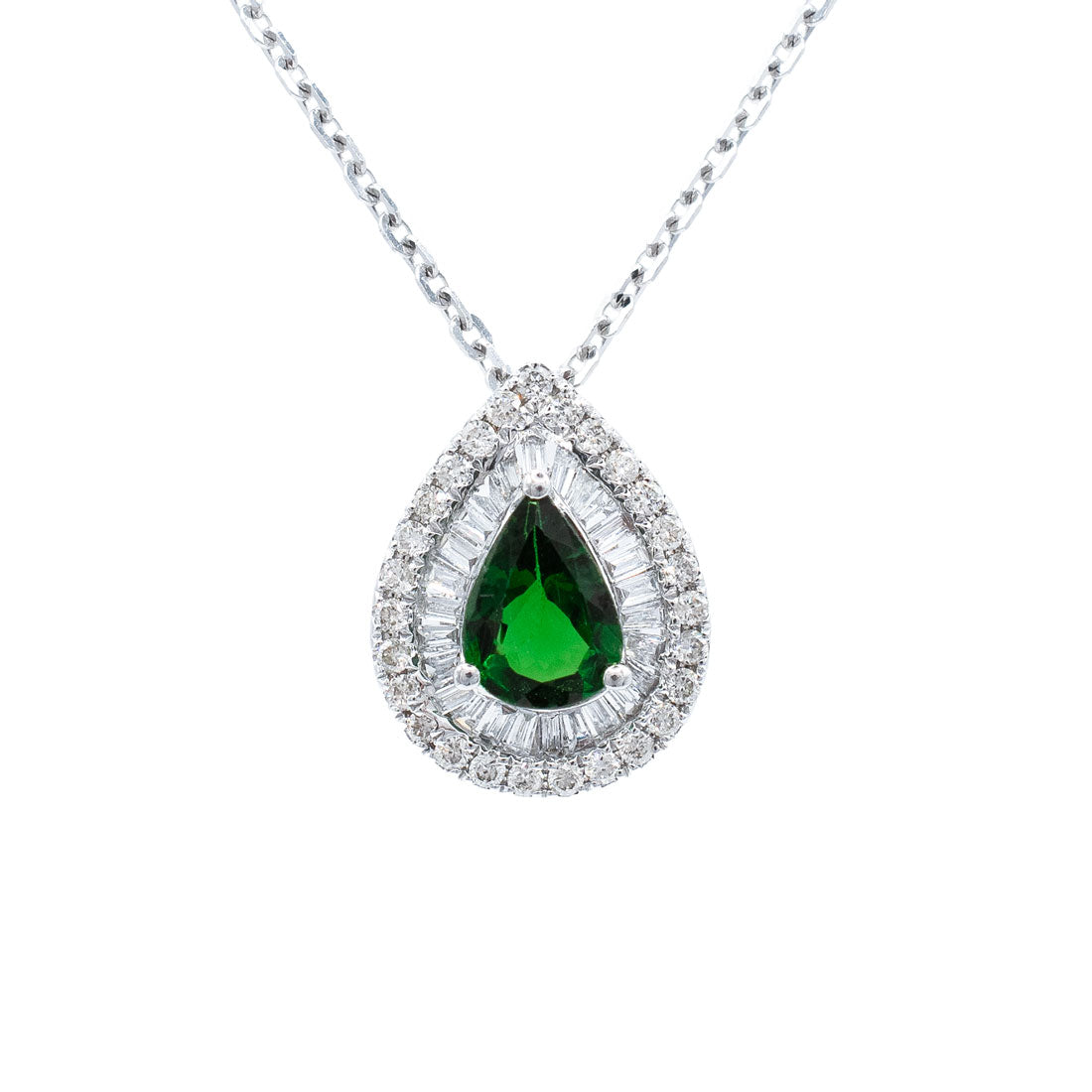 Vibrant and refined, this pendant captures the perfect balance of color and brilliance. At its heart glows a vivid 0.30-carat pear-shaped Tsavorite Garnet — a rare green gemstone prized for its rich, luminous hue. Surrounding the center stone, a stunning arrangement of baguette-cut diamonds fans outward, framed by a delicate halo of round diamonds that amplify its sparkle and create a captivating pear silhouette. Crafted in 18k white gold, this piece drapes gracefully from a hidden slide-style bail on a 17-inch diamond-cut cable chain, allowing the pendant to seem as though it floats against the skin. A timeless yet distinctive design — perfect for the collector who appreciates both color and sophistication.