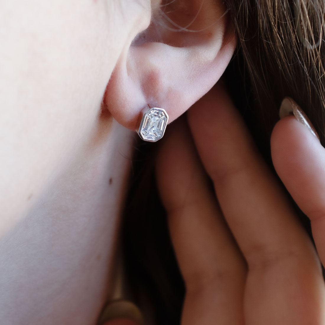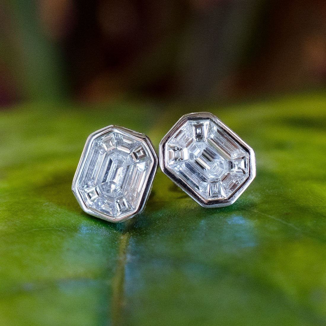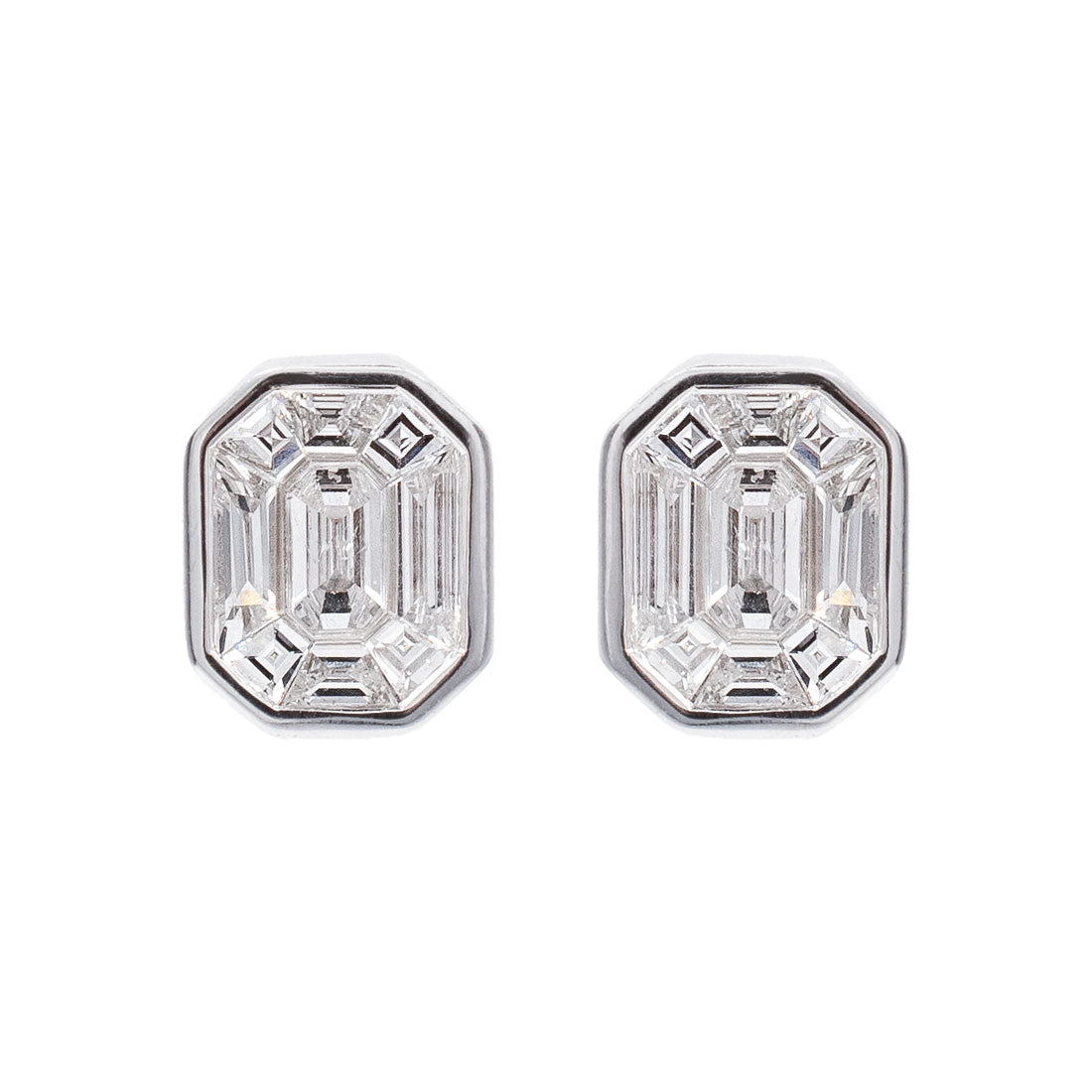 Add timeless elegance to your jewelry collection with these exquisite 18K white gold stud earrings. Designed with a clever illusion setting, multiple multi-shaped diamonds are expertly arranged to mimic the look of a single, larger emerald-shaped stone. From a distance, the earrings appear as substantial diamonds, offering maximum visual impact with an accessible, lightweight feel. The bezel setting not only enhances the illusion but also ensures a sleek, secure fit for everyday sophistication or evening glamour. A perfect gift or personal indulgence, these studs combine brilliance, craftsmanship, and smart design.
