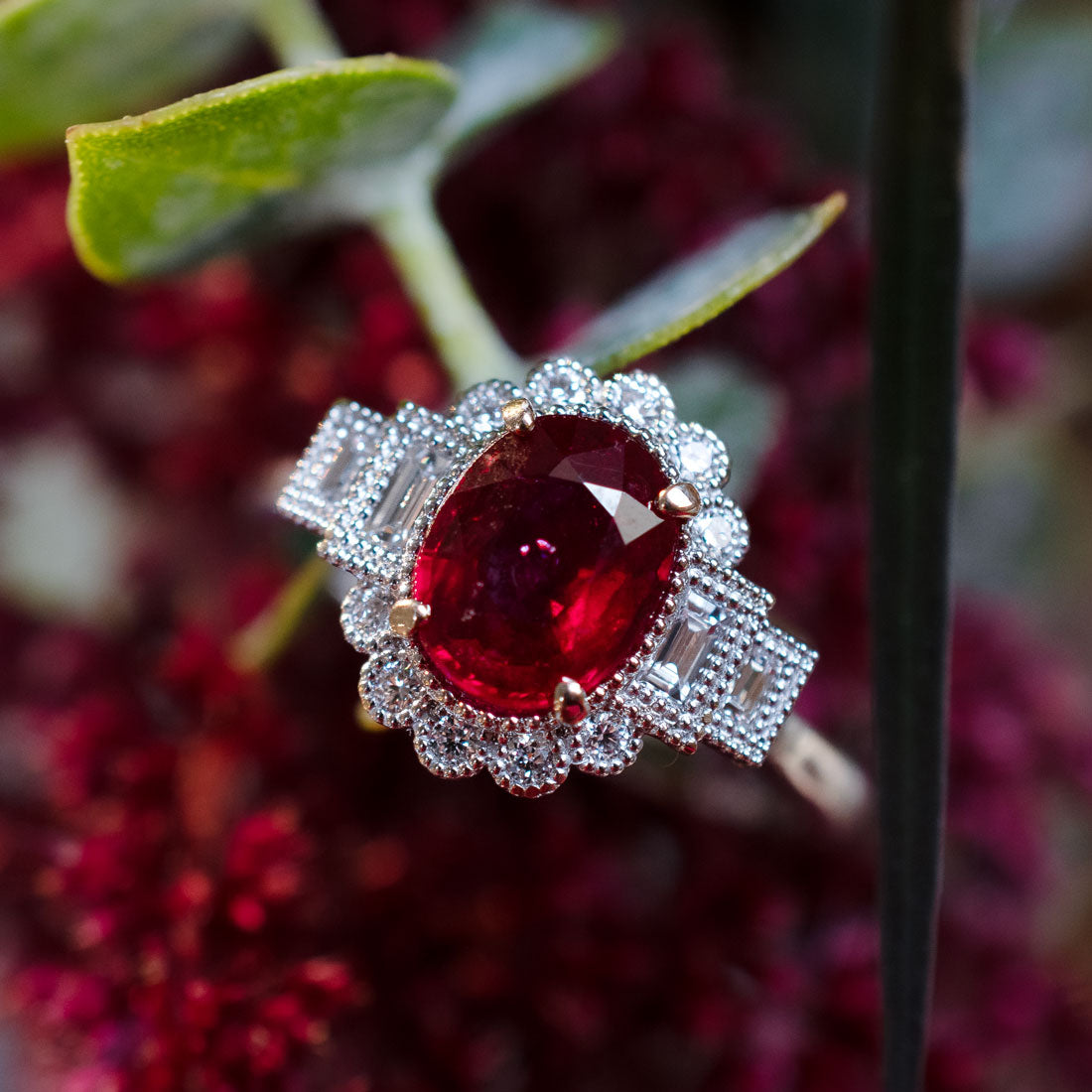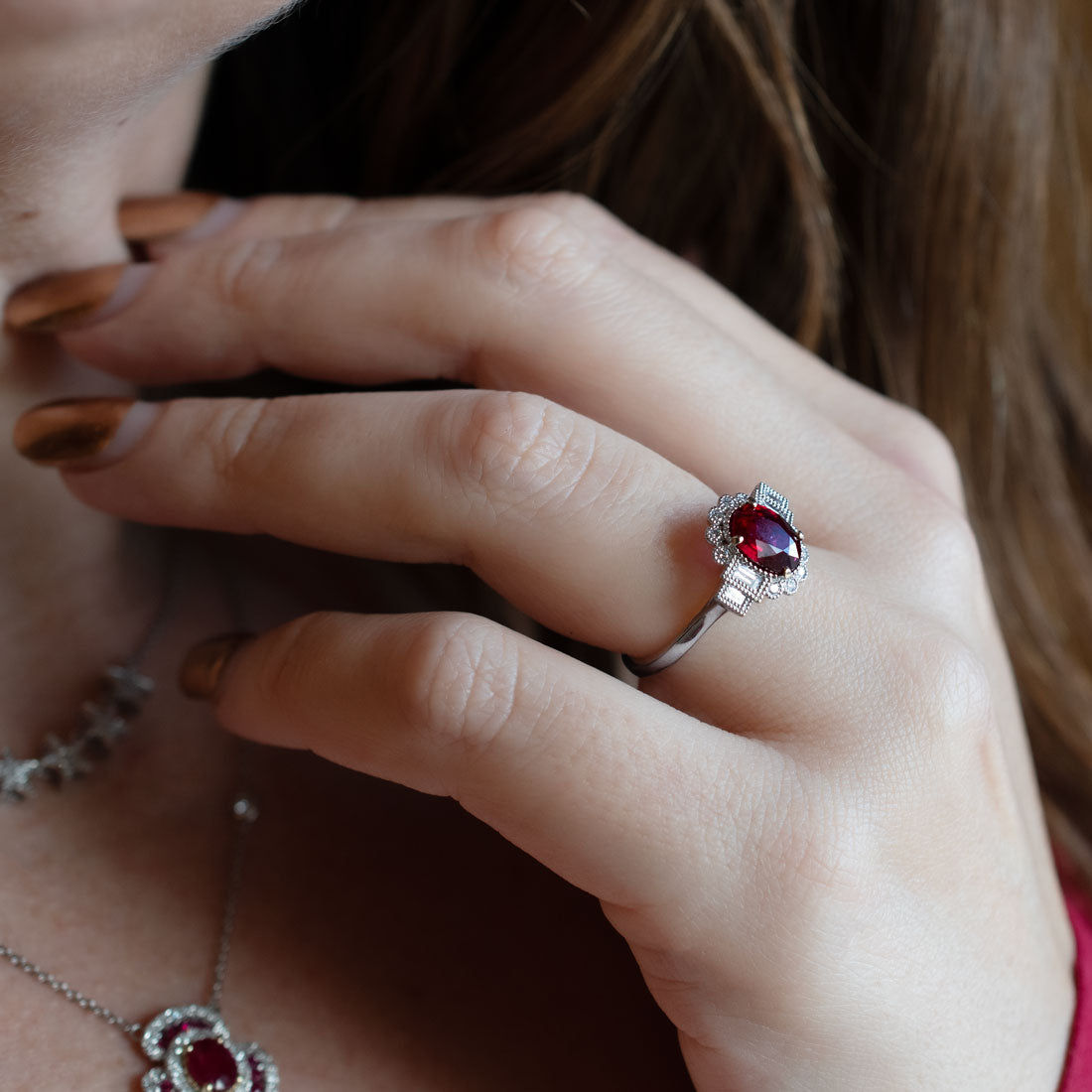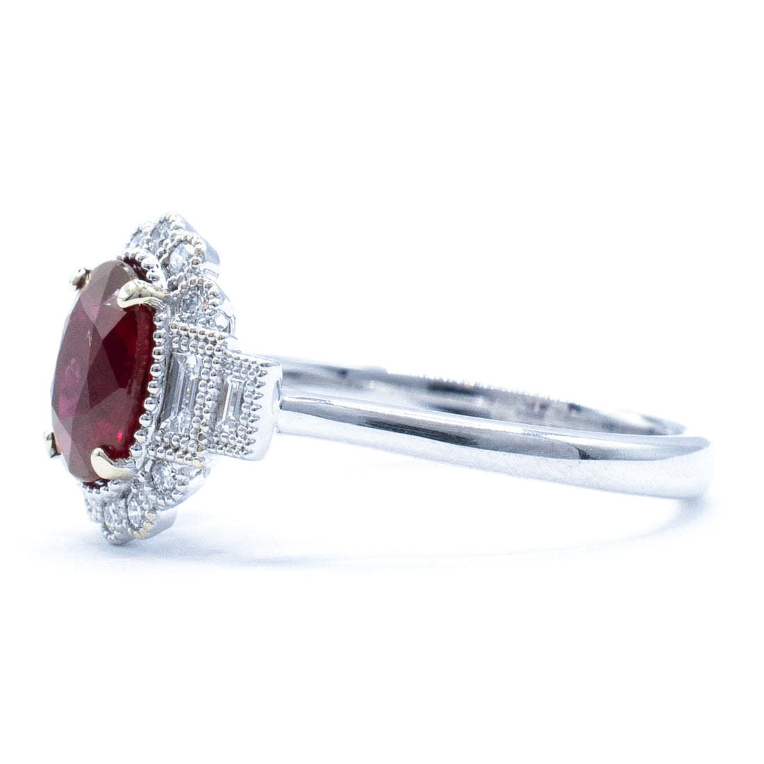 1.63 Carat Oval Ruby and Diamond Vintage-Inspired Ring 18K White Gold