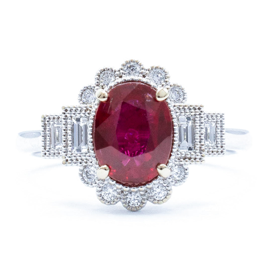 This exquisite 18K white gold ruby and diamond ring blends vintage artistry with timeless sophistication. At the center rests a 1.63 carat natural oval ruby, glowing with rich, saturated red hues that evoke elegance and depth. On each side, two baguette diamonds—one large and one small—create a graceful, balanced silhouette that draws the eye to the ruby’s luminous color.