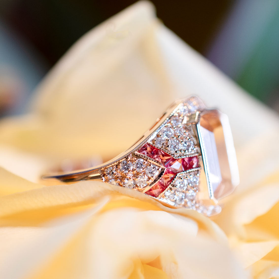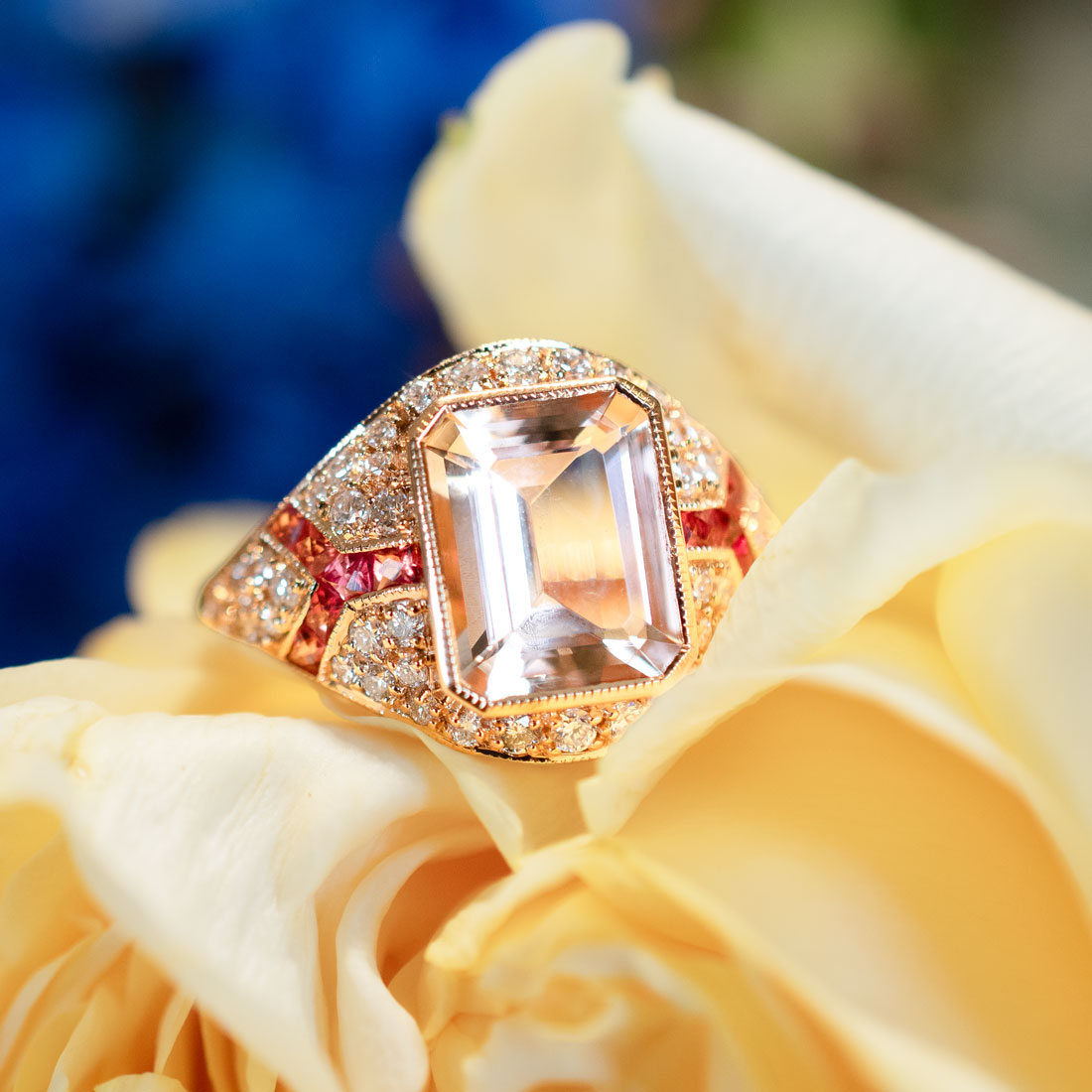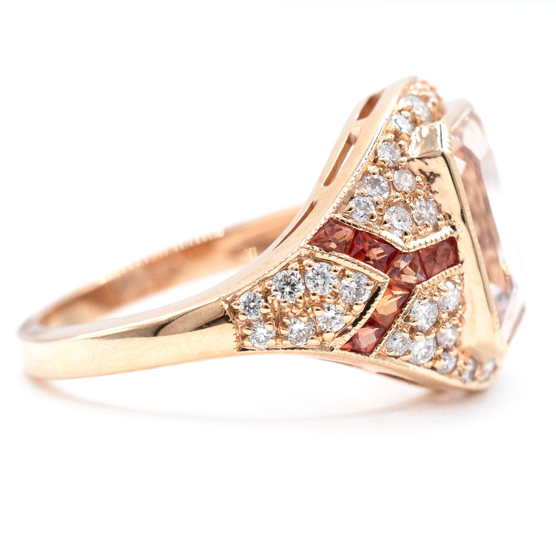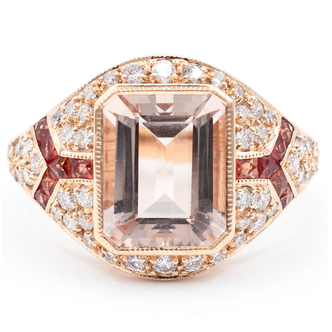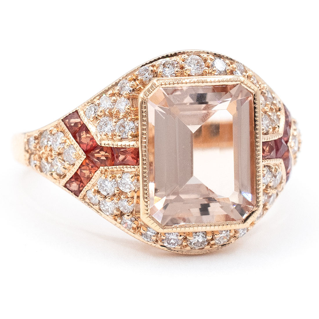 Radiant and refined, this 18K rose gold ring captures the perfect harmony of warmth and elegance. At its heart glows a 2.70-carat emerald cut morganite, bezel set and bordered with delicate milgrain detailing for a touch of vintage artistry. The softly domed band is adorned with 48 round diamonds, adding brilliance that complements the morganite’s blush tones. Alongside the center stone, a graceful pattern of vivid orange sapphires introduces a unique play of color and sophistication. A one-of-a-kind creation, this ring exudes romantic charm and timeless allure — perfect for the collector who cherishes distinctive fine jewelry.