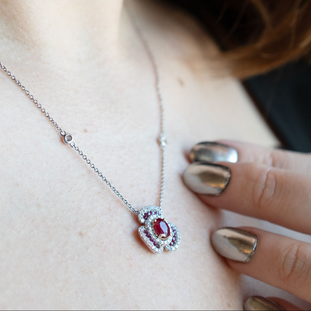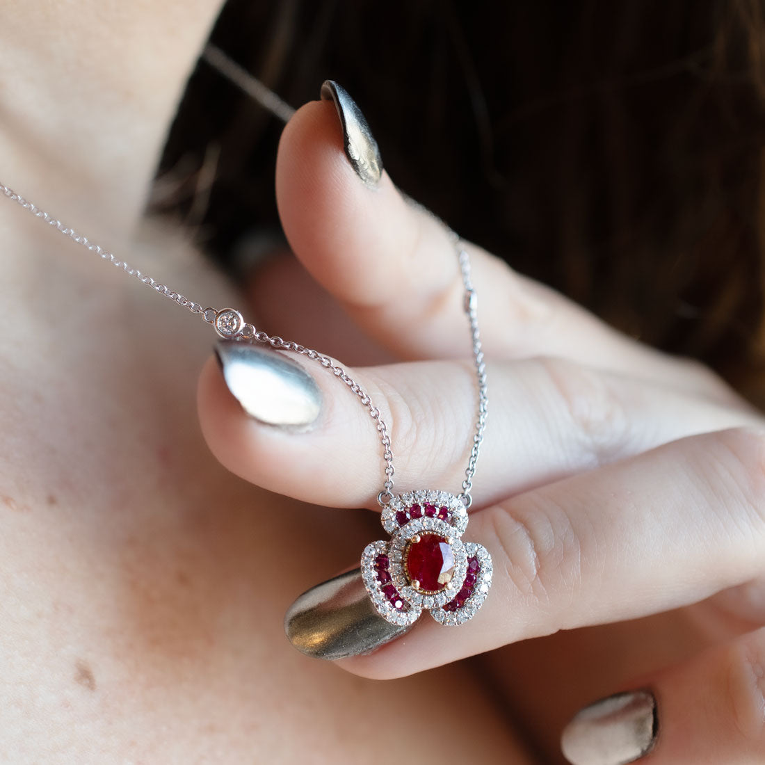 Radiate timeless elegance with this exquisite 14k White Gold Ruby and Diamond Necklace, a refined blend of color, craftsmanship, and brilliance. At its center, a vivid oval ruby is prong-set in warm yellow gold and framed by a delicate milgrain border, adding vintage-inspired charm. A sparkling halo of diamonds enhances the ruby’s rich hue, while three graceful clusters of round rubies encircled by diamonds create a subtle floral petal motif — intricate, feminine, and utterly captivating.