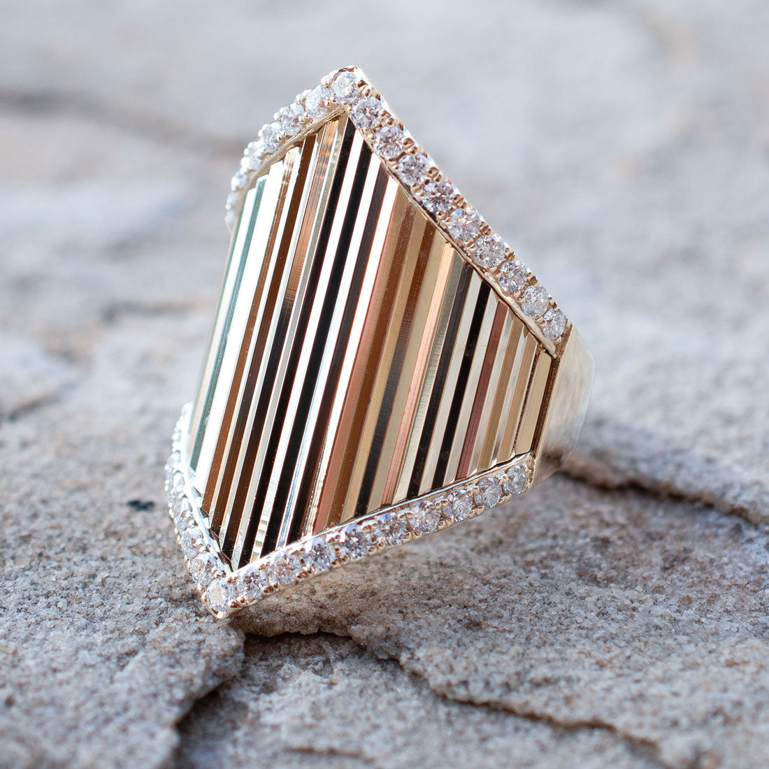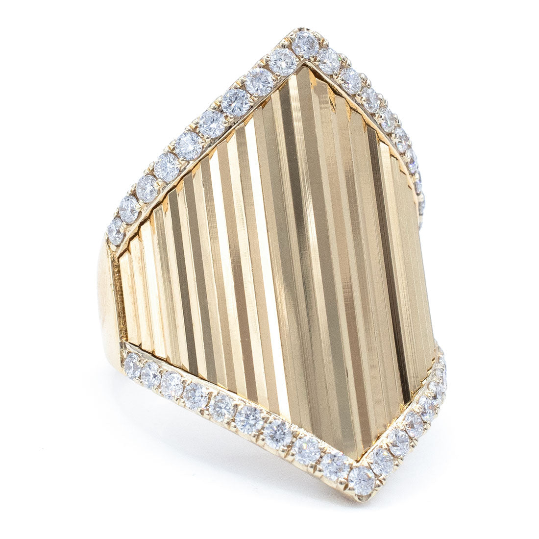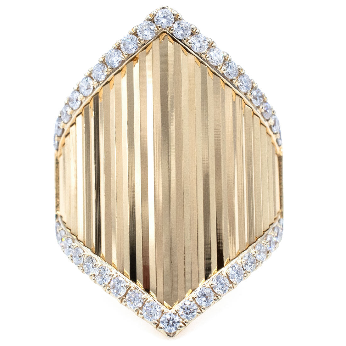 Command attention with a statement piece that redefines modern edge. Crafted in radiant 14k yellow gold, this striking ring features a sculptural, shield-like silhouette that exudes confidence and strength. The fluted texture catches the light with every movement, adding depth and dimension to its bold form. Framing the design, twin borders of glittering diamonds — totaling 0.66 carats — lend a touch of refined brilliance that balances the ring’s daring structure. Measuring 27 mm across the front, this piece isn’t made to blend in — it’s made to lead. Perfect for the collector who craves sophistication with a fearless twist.