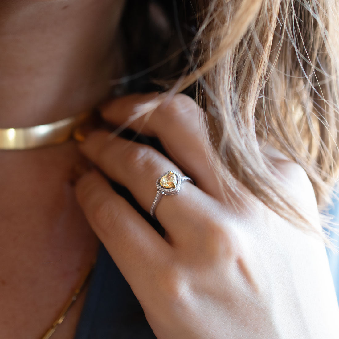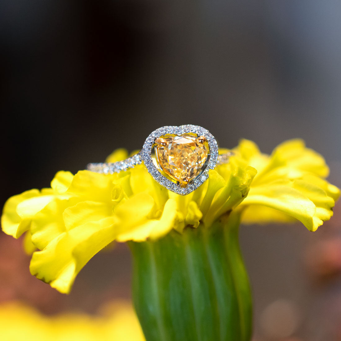 Celebrate love with a twist in this enchanting 18K white gold ring, centered by a breathtaking 1.01 carat heart-shaped diamond in a rich, buttery yellow hue. Framed by a delicate diamond halo, the vibrant center stone glows with warmth and elegance. The band features an artful, slightly asymmetrical curve—subtle and modern—adding a touch of individuality to the classic halo design. With 0.17 carats of accent diamonds glistening along the band and halo, this ring beautifully balances timeless romance with contemporary edge. A perfect piece for someone who loves distinctive luxury and graceful details.